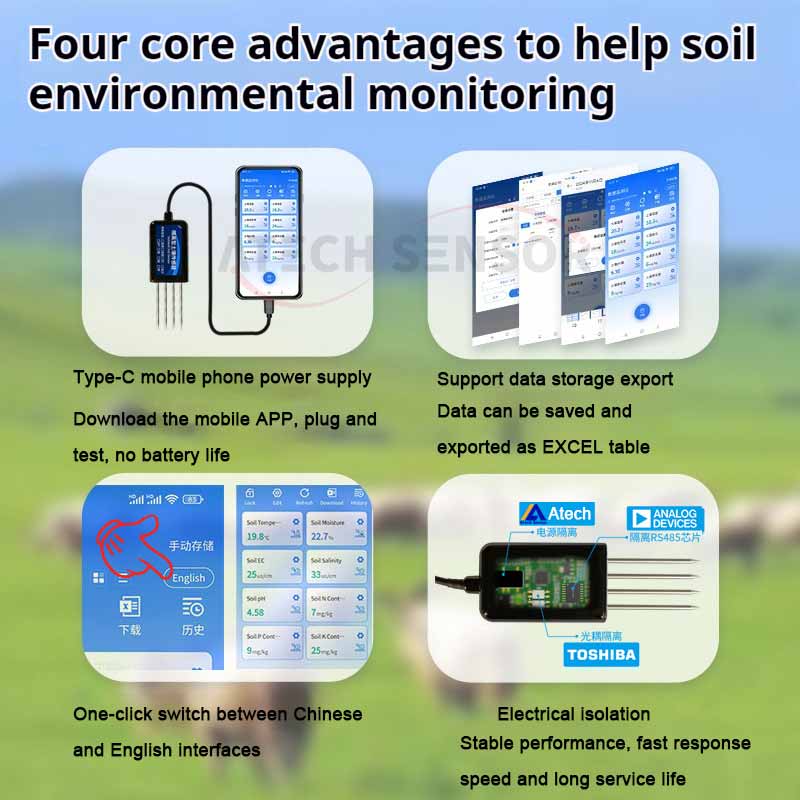 This sensor combines soil temperature and moisture functions. It monitors these two important factors at the same time. This gives real-time insights into soil conditions.