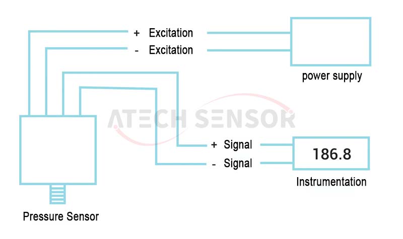 Pressure sensors with millivolt outputs are often used in laboratory applications. The main characteristics are low cost, small size, and the need for a regulated power supply. The level of the millivolt signal is very low, limited to short distances (generally considered to be up to 200 feet) and easily affected by other nearby electrical signals (other instruments, Stray electrical interference from high-voltage AC voltage lines, etc.). The typical wiring configuration of a millivolt output pressure sensor is shown in the figure below: