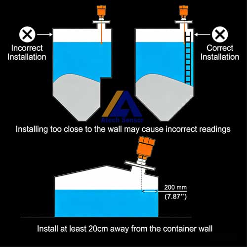 - Mounting Position: Install at a distance of more than 200 mm from the vessel wall with an included angle of ≤5° to the wall, ensuring the signal is transmitted directly to the measured medium surface. Meanwhile, keep away from interference sources such as feed inlets and agitators.